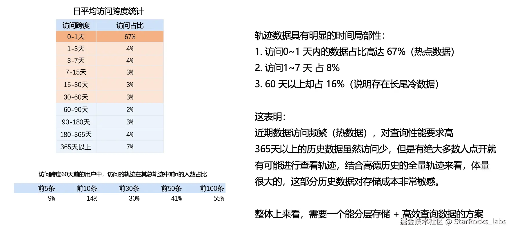 - 60 天以上覆盖更长周期的历史数据,整体访问占比约为 16% 。尽管访问频次相对较低,但由于其代表全量历史沉淀,体量非常大,可定义为冷数据。