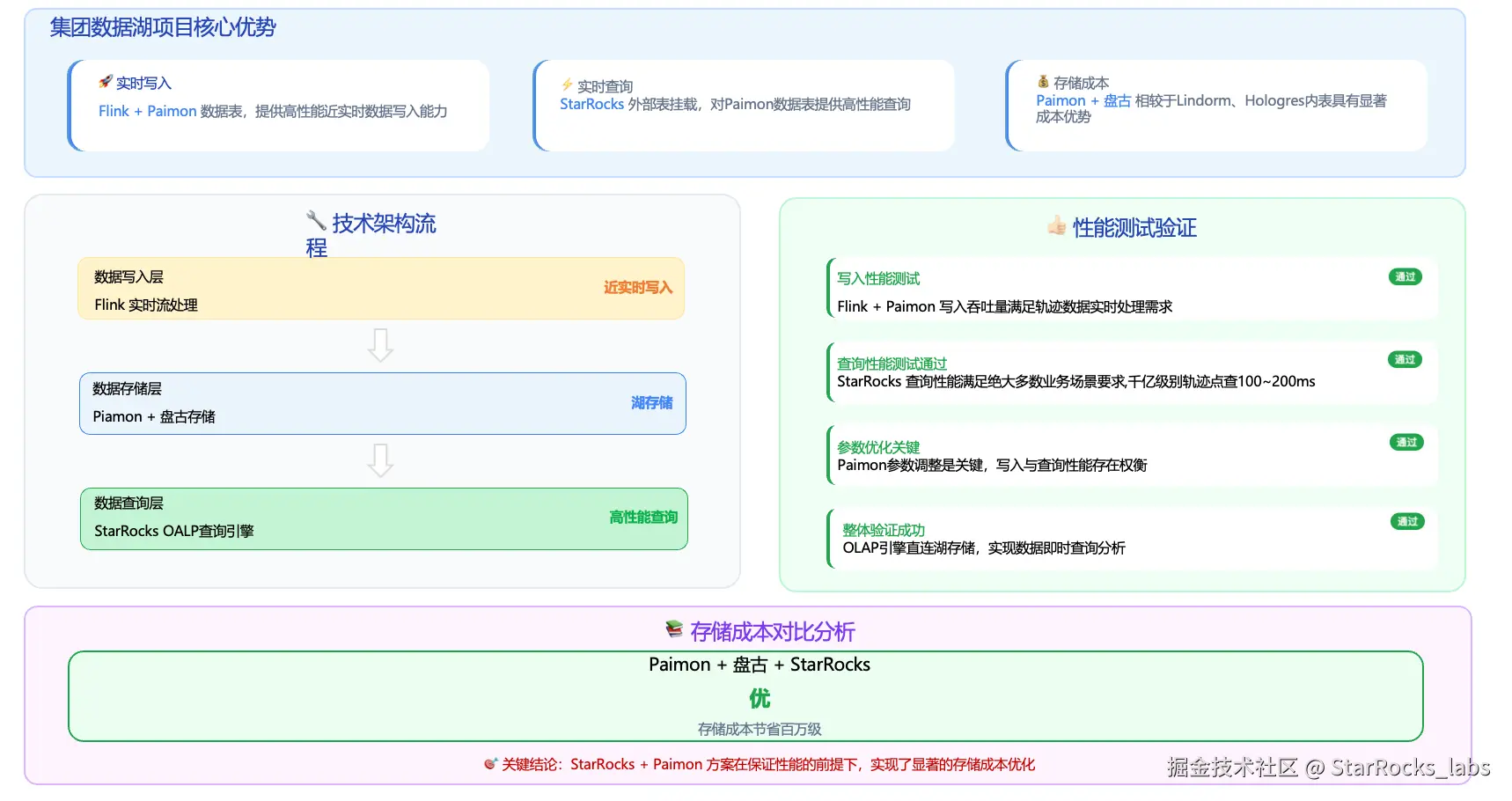 总体而言,StarRocks + Paimon 方案在满足性能指标的前提下,实现了明确的成本优化效果。