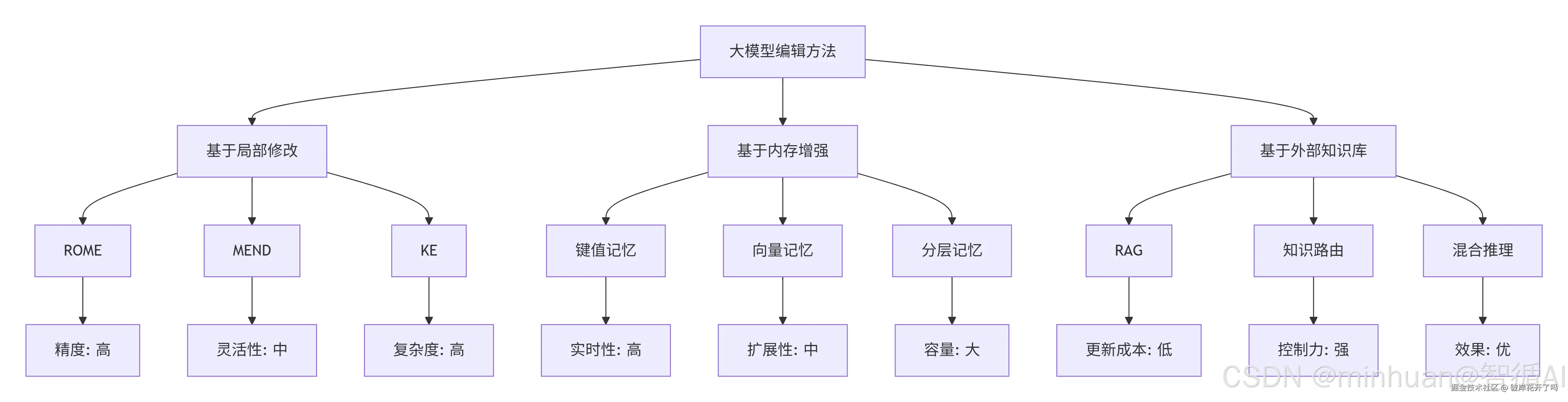 - 基于局部修改的方法(如ROME、MEND)通过精准修改模型内部权重实现知识更新;
