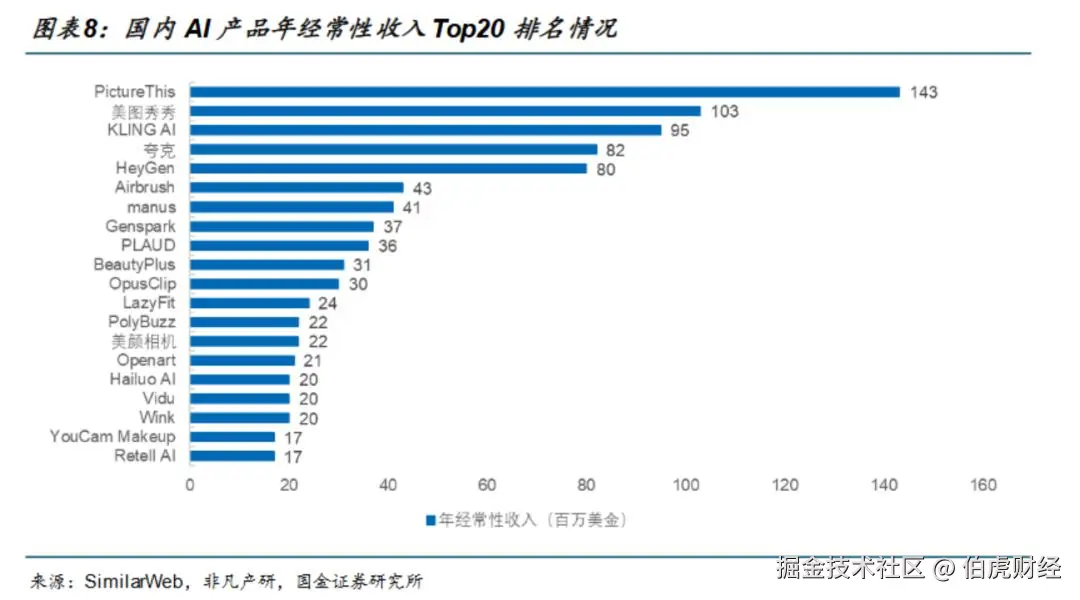 而在国内市场,可灵的收入则稳居第一梯队。截至2025年7月,国内 AI 产品收入排名前三的应用分别为 PictureThis、美图秀秀、KLING AI。其中,刚刚登陆资本市场的Minimax,据外媒报道,其2024年的ARR约为7000万美元。