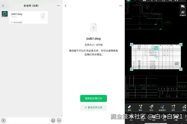 微信或者QQ接收对方发来的图纸,选择用【浩辰CAD看图王】软件打开,就可以看到图纸里面的图片、Excel、word等OLE对象。可点击OLE对象放大或者缩小、以及拖动至图纸其他位置。并且可直接分享包含完整OLE对象的图纸给协作方,确保协作方看到完全相同的内容。