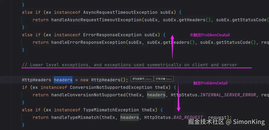 小编这里不太理解为什么会从中间分开,上半部分异常不会触发ProblemDetail异常包装,而下半部分会触发。