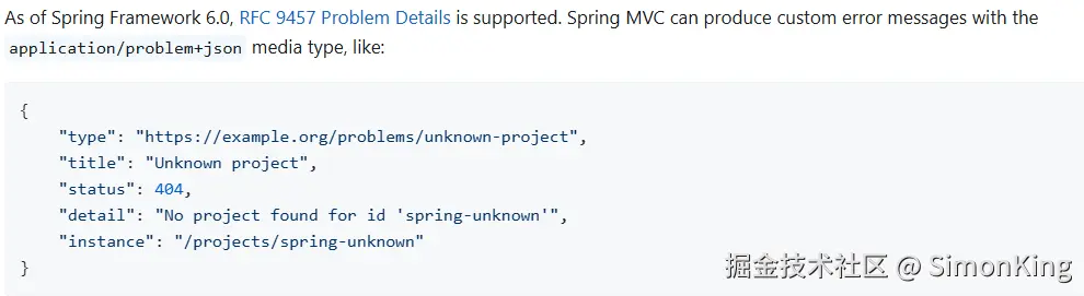 大致意思是:要想启用RFC响应,可以扩展ResponseEntityExceptionHandler并声明@ControllerAdvice。处理器通过@ExceptionHandler采集异常,也可以添加其他异常并映射到ProblemDetail