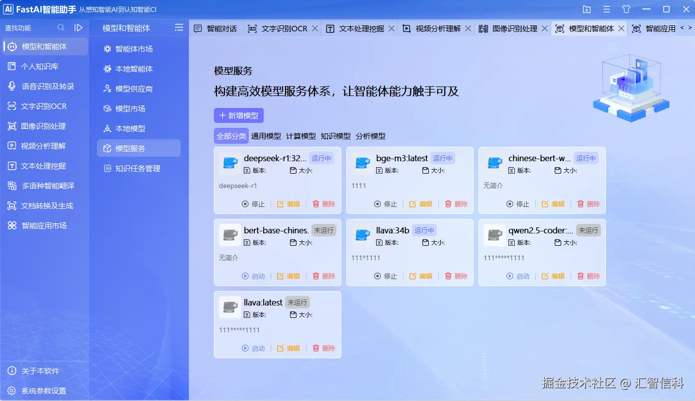 FastAI是专为个人用户打造的本地化人工智能助手,采用原生C++开发,助力用户轻松构建专属“私域大模型”。它聚焦多模态交互,覆盖文本、图像、语音、知识管理、创作等多场景,支持写作辅助、OCR识别、音频转文字、智能问答、PPT生成等强大功能。FastAI还支持本地知识流图形化编排,无缝对接FastCI平台,实现“云边协同+场景融合”,将AI从云端带入桌面,开启智能生活新方式。