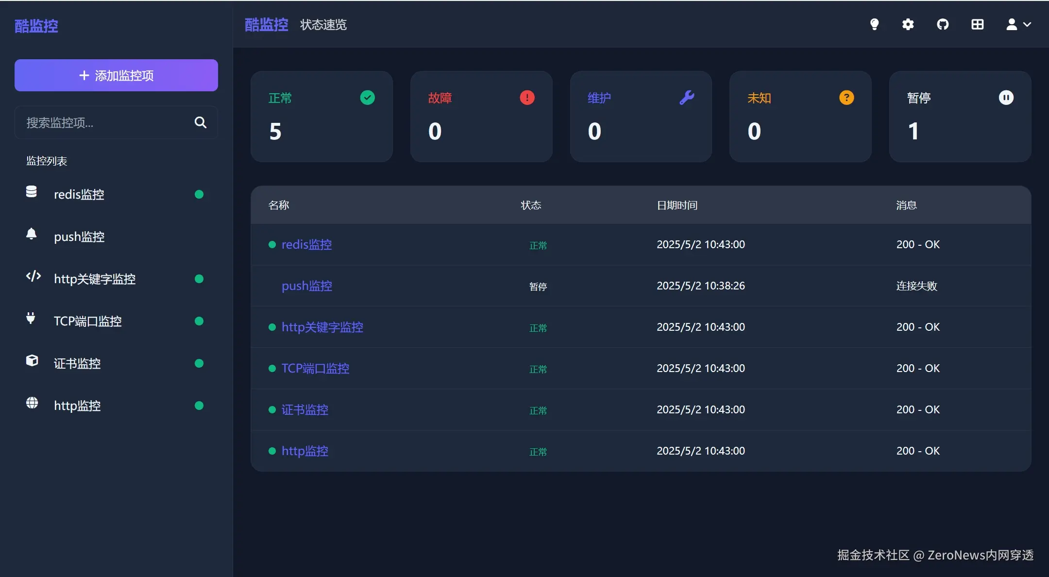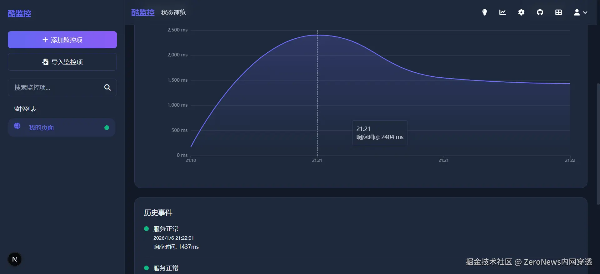 酷监控是一个高颜值的监控工具,支持网站监控/接口监控/HTTPS证书监控等多种监控类型,帮助开发者及运维人员实时掌握网站/接口运行状态。本项目支持Windows/Docker一键快速部署,拥有美观现代的界面设计。