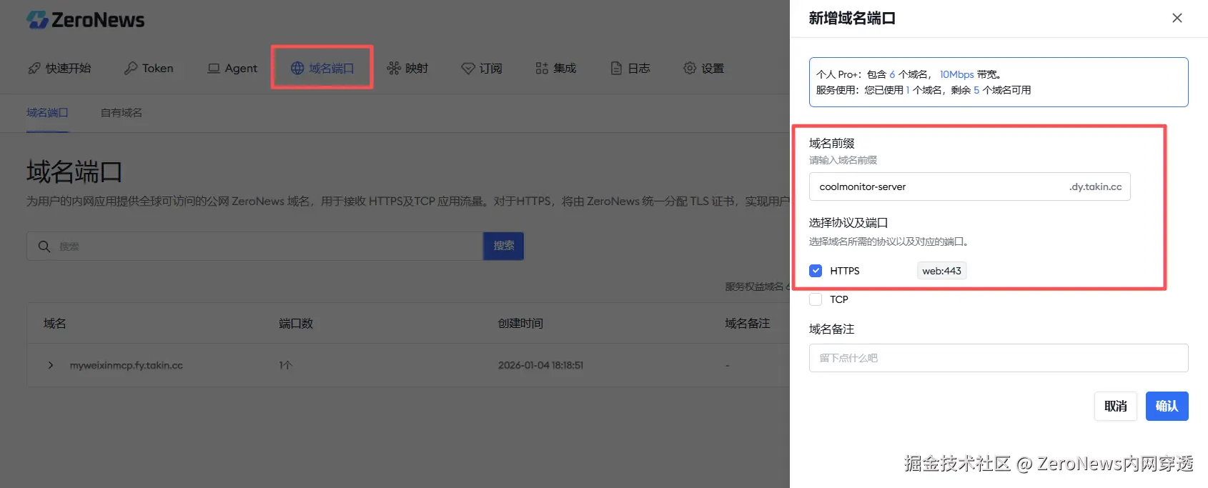 3、 接着,我们在域名端口页面,创建一个可用的公网域名(自定义前缀),并勾选HTTPS 协议端口。