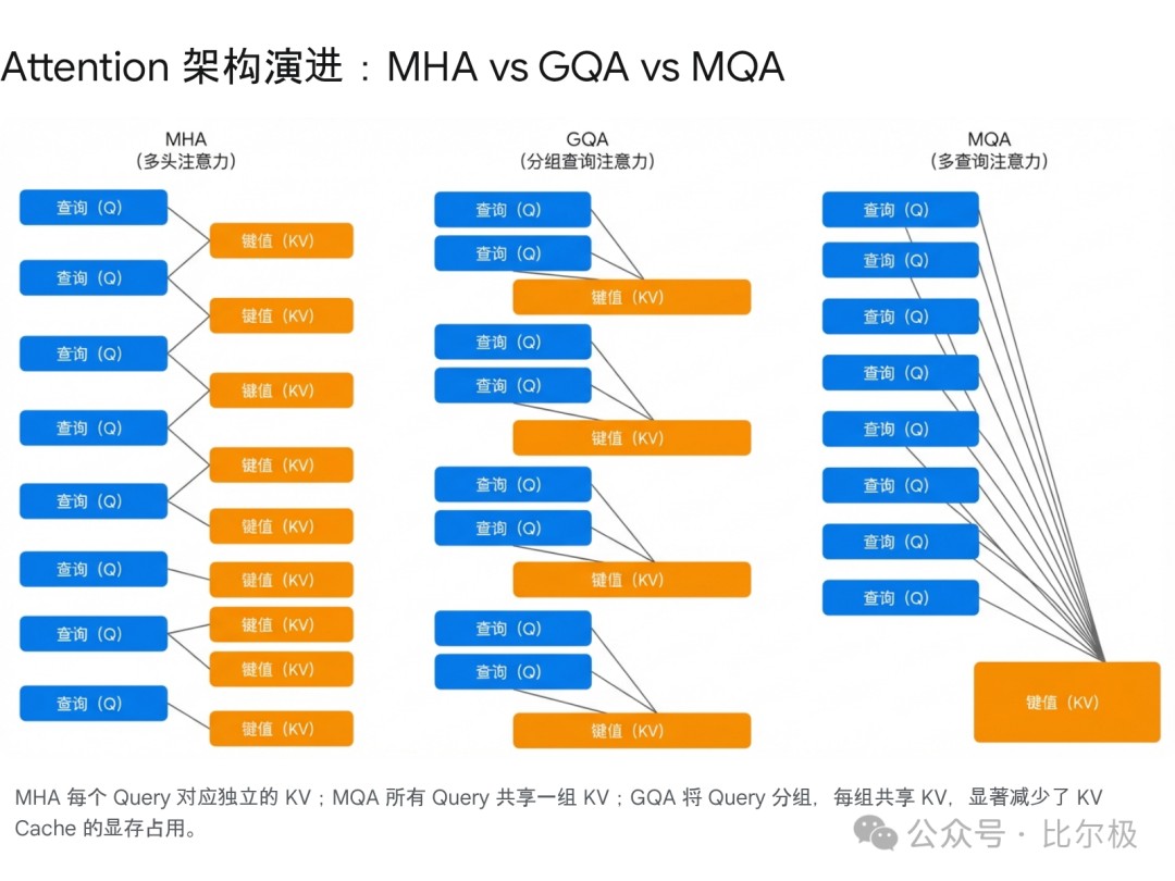 虽然这让计算量从 O(T²) 降到了 O(T),但代价是显存爆炸。这也是为什么现在 MQA/GQA 这么火的原因。