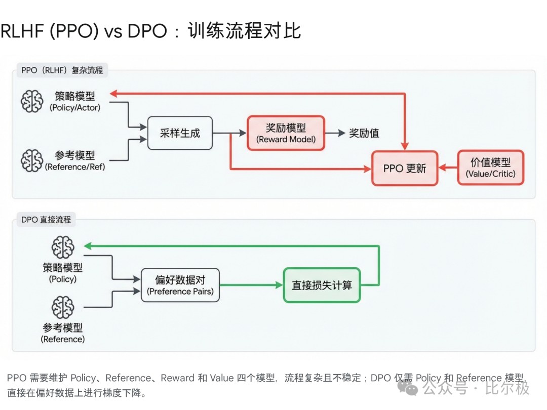 Reward Model: 必须输出一个 “绝对分数”。通常我们是用 Preference Data 训练 Reward Model,或者直接用 DPO 绕过 Reward Model。
