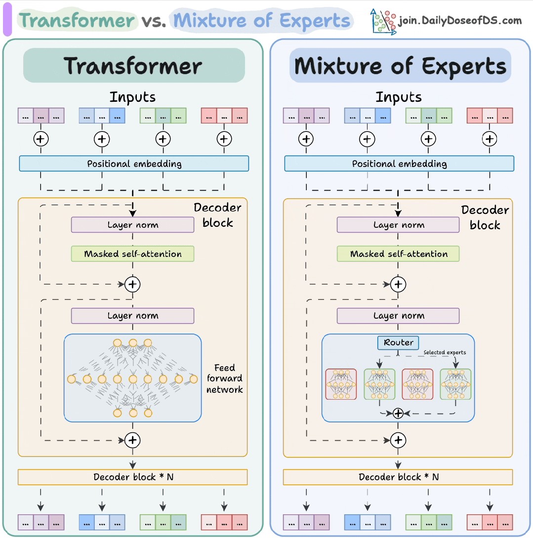 它把一个大层拆成很多小专家(Experts)。对于每个 Token,路由器(Router)只挑 2 个最懂的专家来处理。