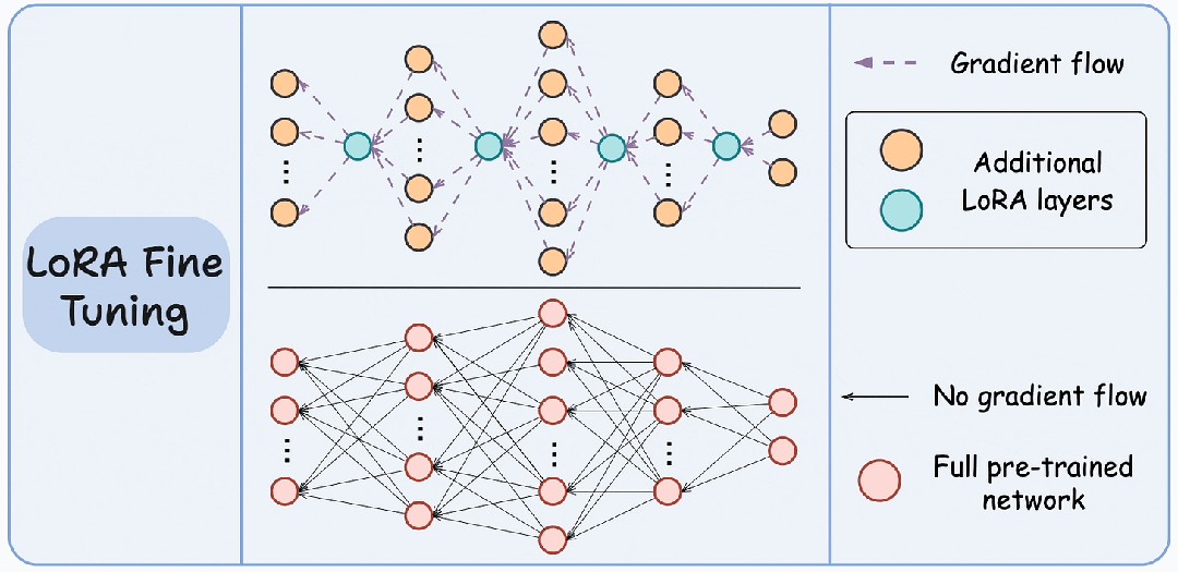 LoRA (Low-Rank Adaptation) 的思路是:“大哥(主权重)你别动,我在旁边挂个小弟。”