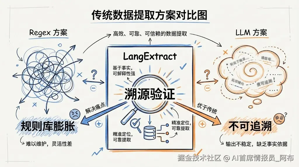 LangExtract 的思路很有意思,它不再指望 AI 像人一样"理解"后再转述,而是按着 AI 的头让它做物理定位。