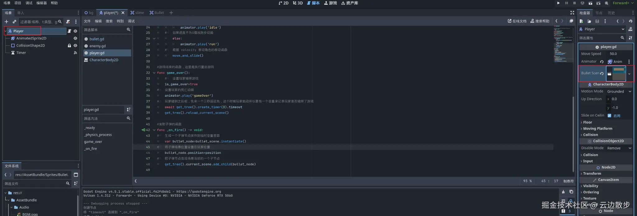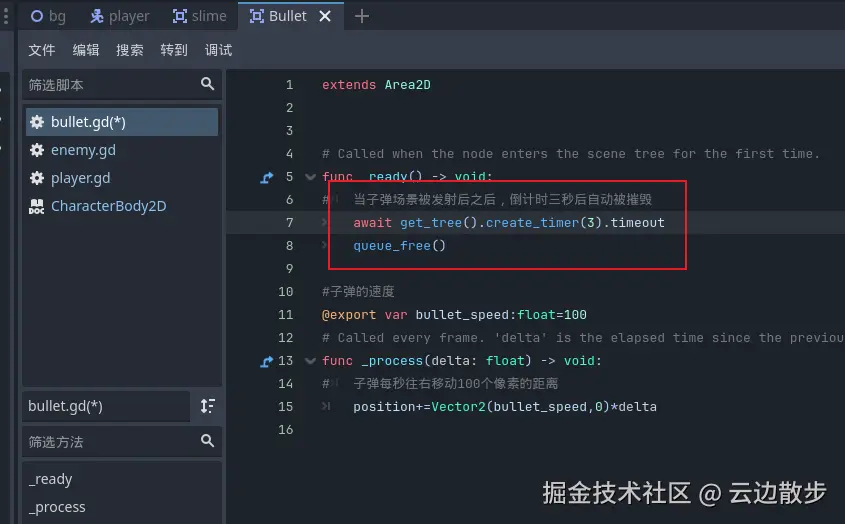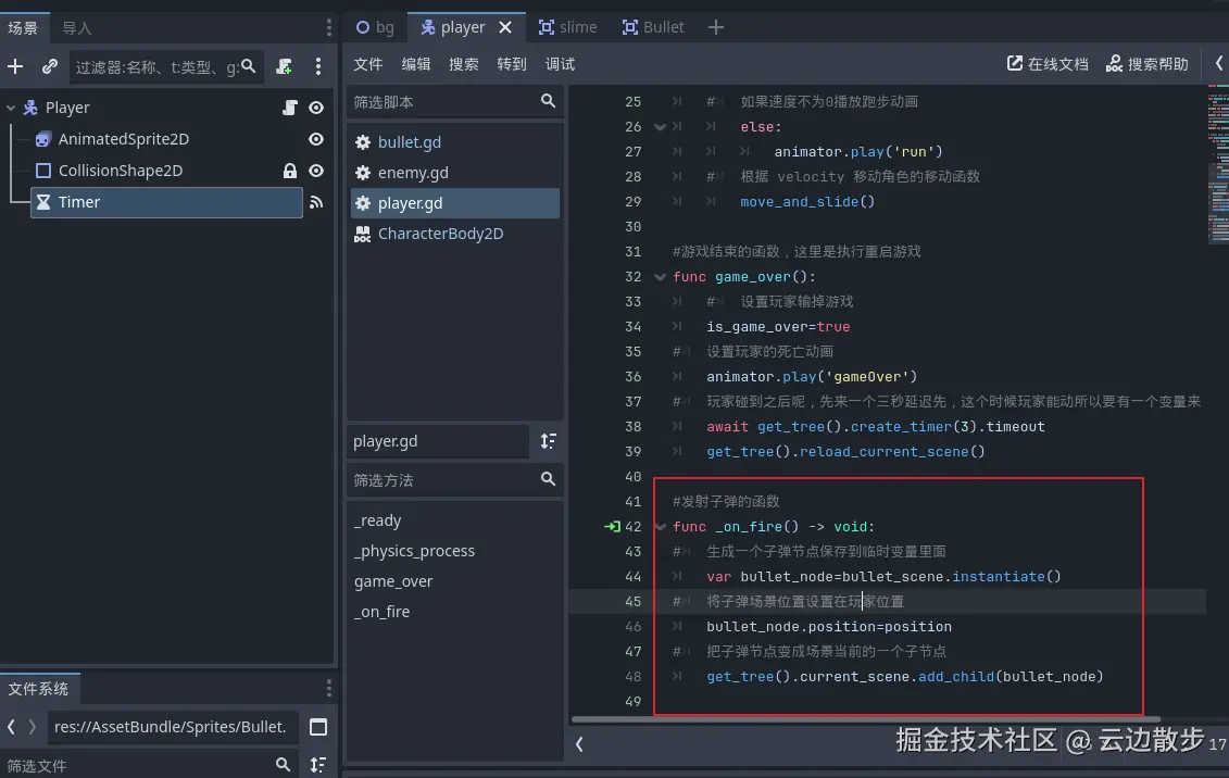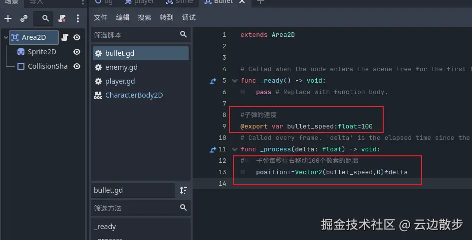 Area2D作为根节点,用于检测子弹与敌人的碰撞;添加Sprite2D显示子弹图片,并配置CollisionShape2D(矩形)作为碰撞体,调整大小与位置后保存为Bullet场景。随后在子弹根节点编写脚本,定义可在检查器中调整的速度变量,使子弹以固定速度持续向指定方向移动。 - 接着实现玩家自动发射子弹机制:在玩家场景中添加