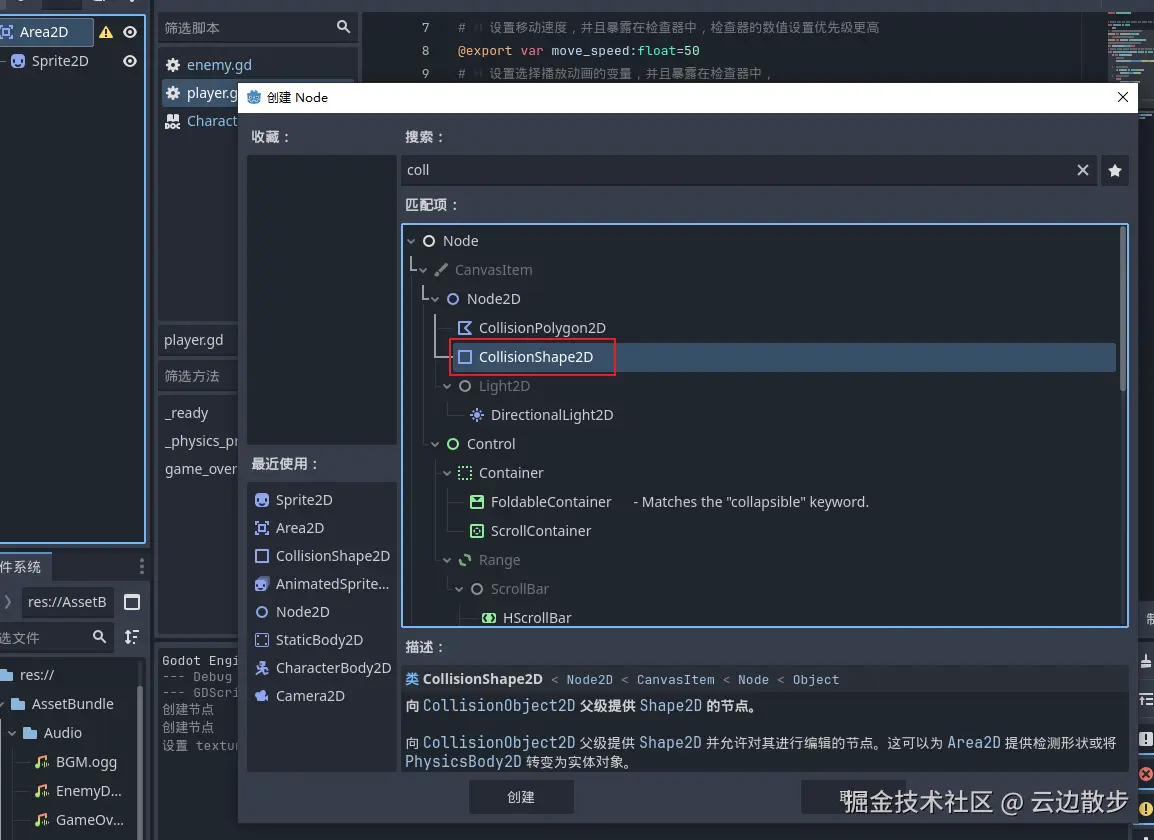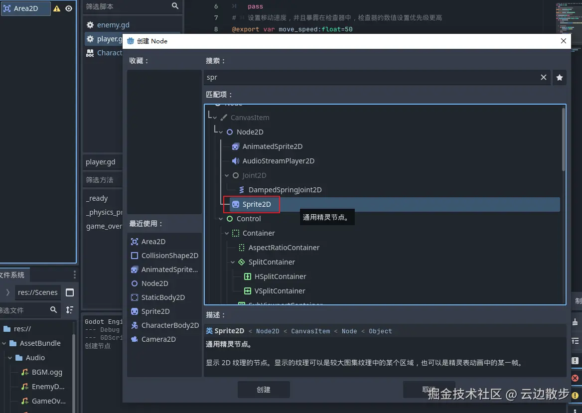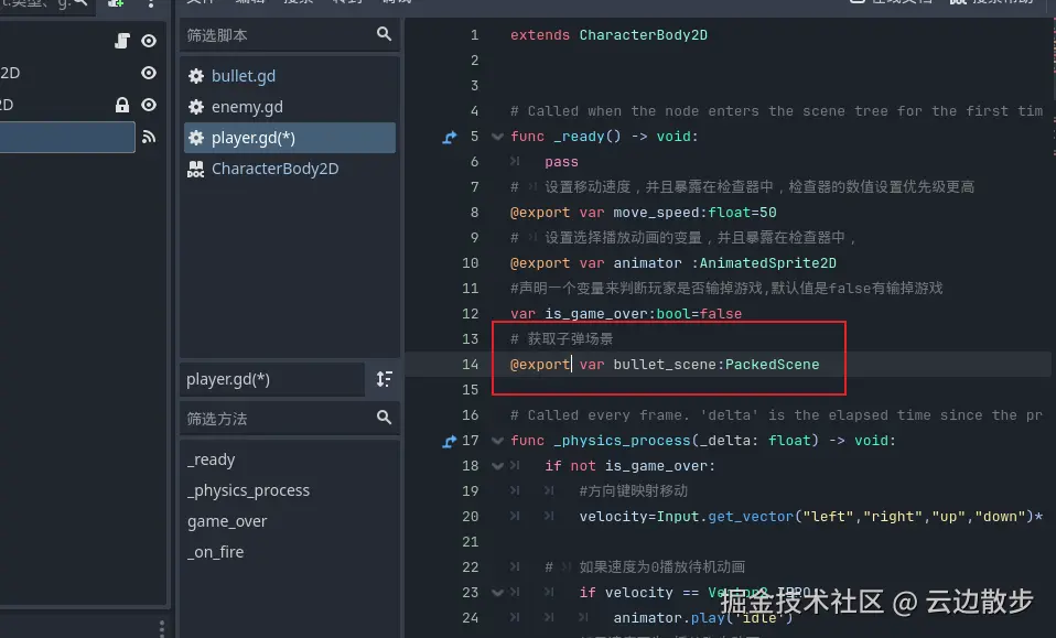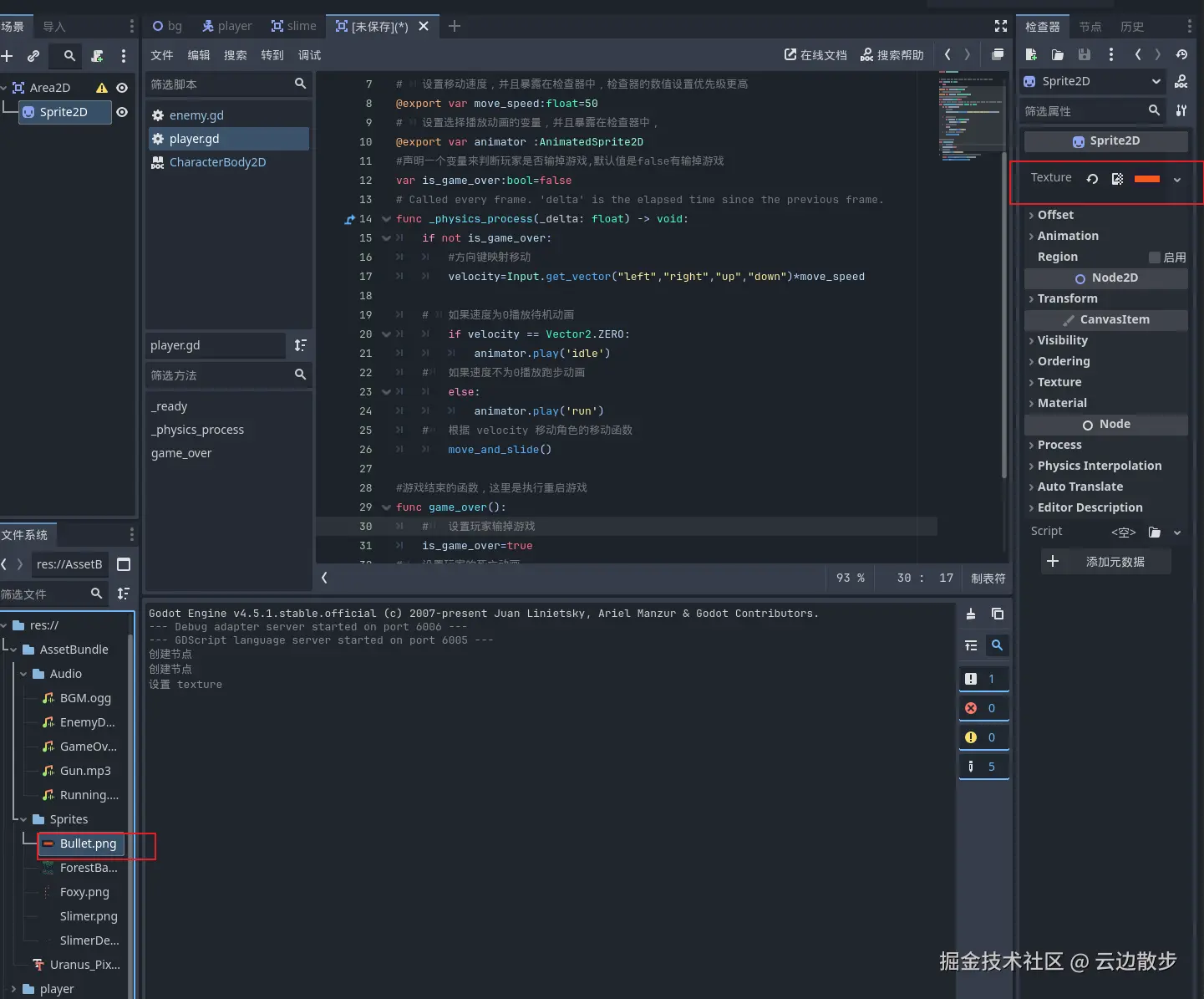 Area2D作为根节点,用于检测子弹与敌人的碰撞;添加Sprite2D显示子弹图片,并配置CollisionShape2D(矩形)作为碰撞体,调整大小与位置后保存为Bullet场景。随后在子弹根节点编写脚本,定义可在检查器中调整的速度变量,使子弹以固定速度持续向指定方向移动。 - 接着实现玩家自动发射子弹机制:在玩家场景中添加