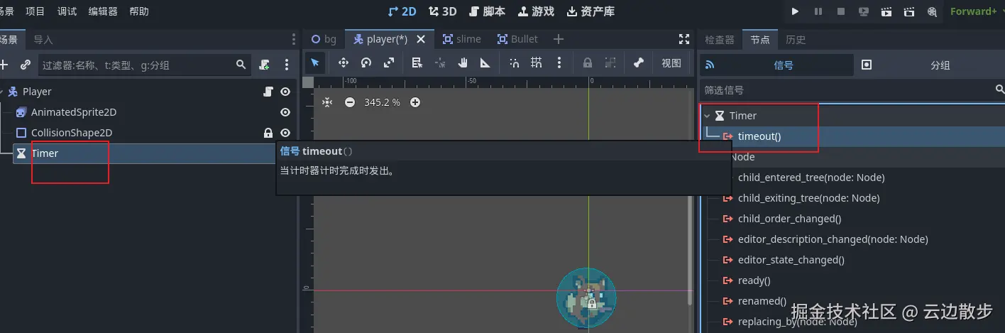 然后我们来到timer节点右侧的信号,找到专属的信号事件,叫timeout,这个信号事件是每次倒计时结束的时候都会被触发