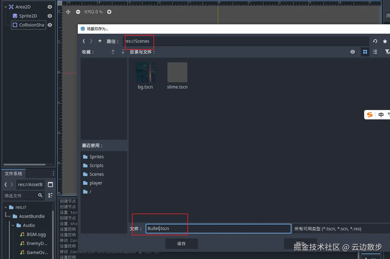 然后保存这个场景到scense文件夹中,起名为Bullet
