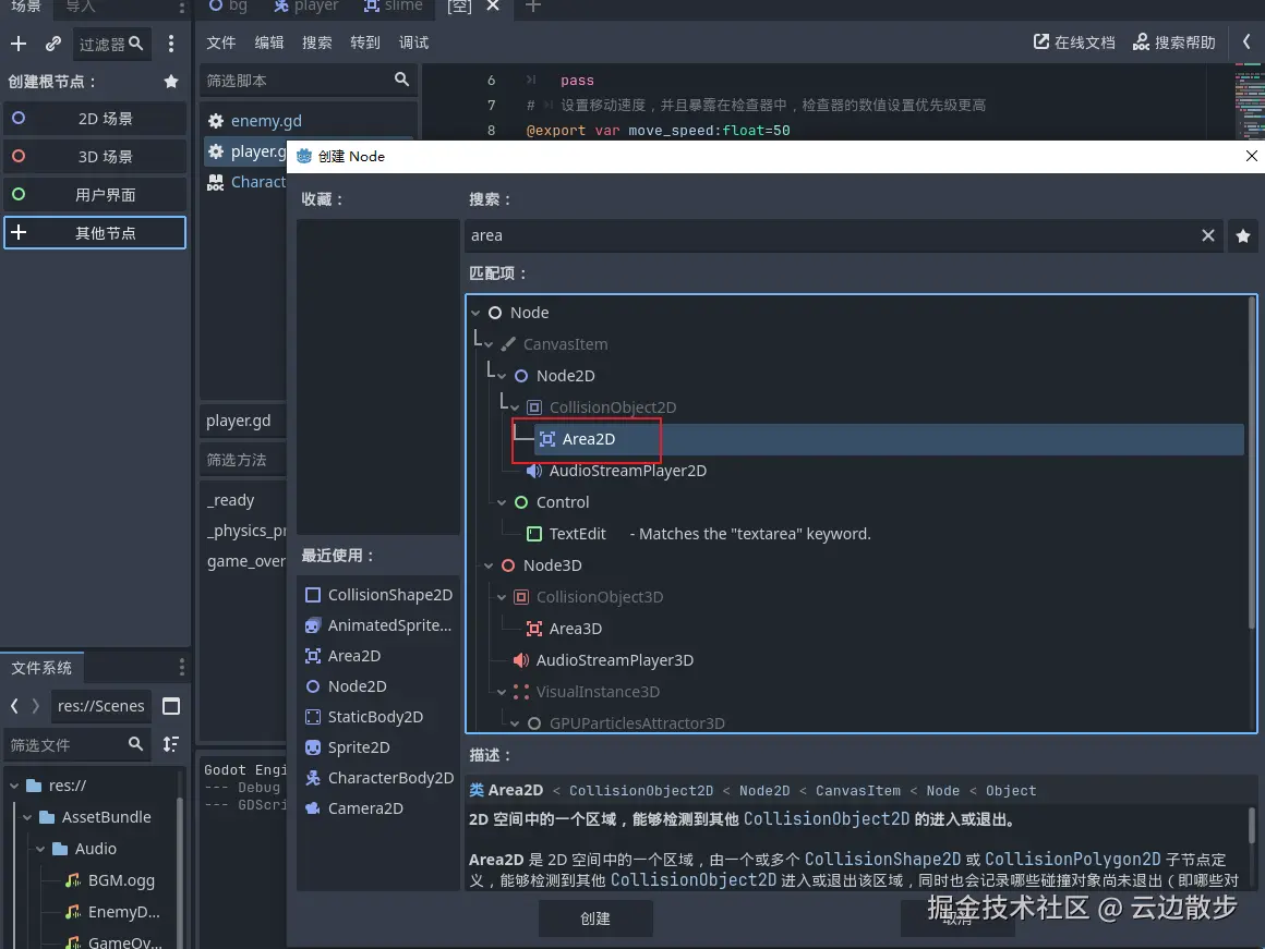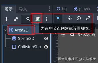 子弹场景的根节点也是选择area2d,因为我们需要判断子弹是否撞到了史莱姆