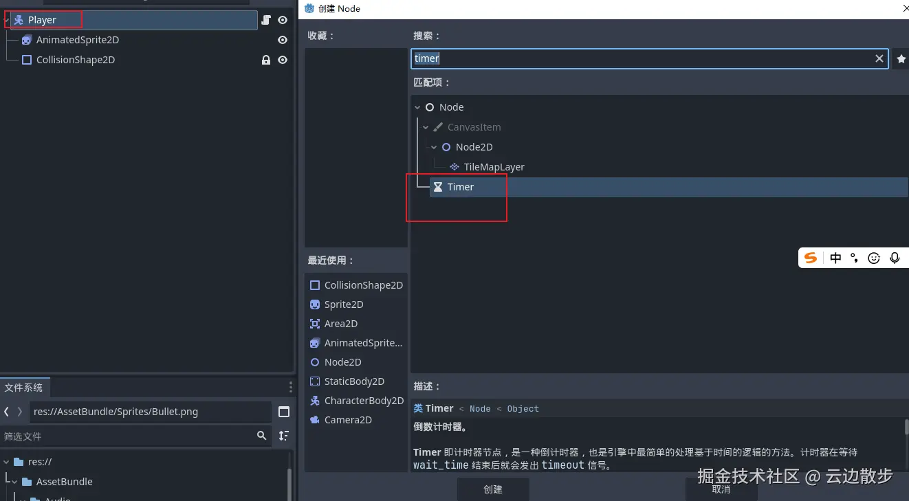 让玩家角色根据倒计时每秒都进行自动释放子弹,在玩家场景添加一个新的时间节点,timer