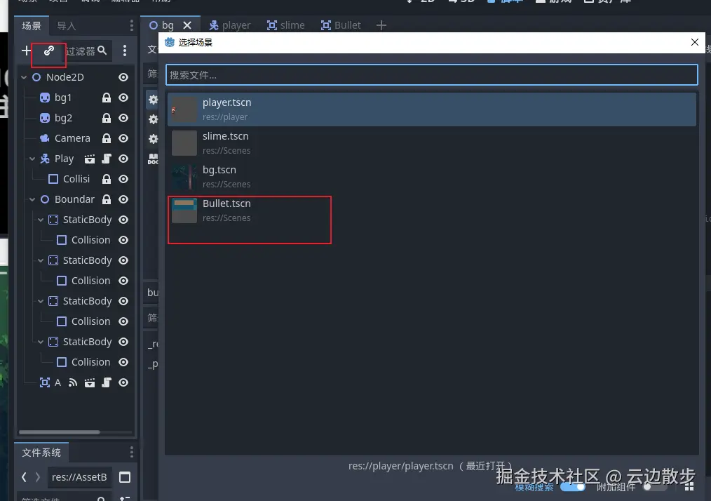 我们接着到玩家场景节点右侧的检查器去设置好获取子弹场景,点击快速加载然后选择子弹场景就好
