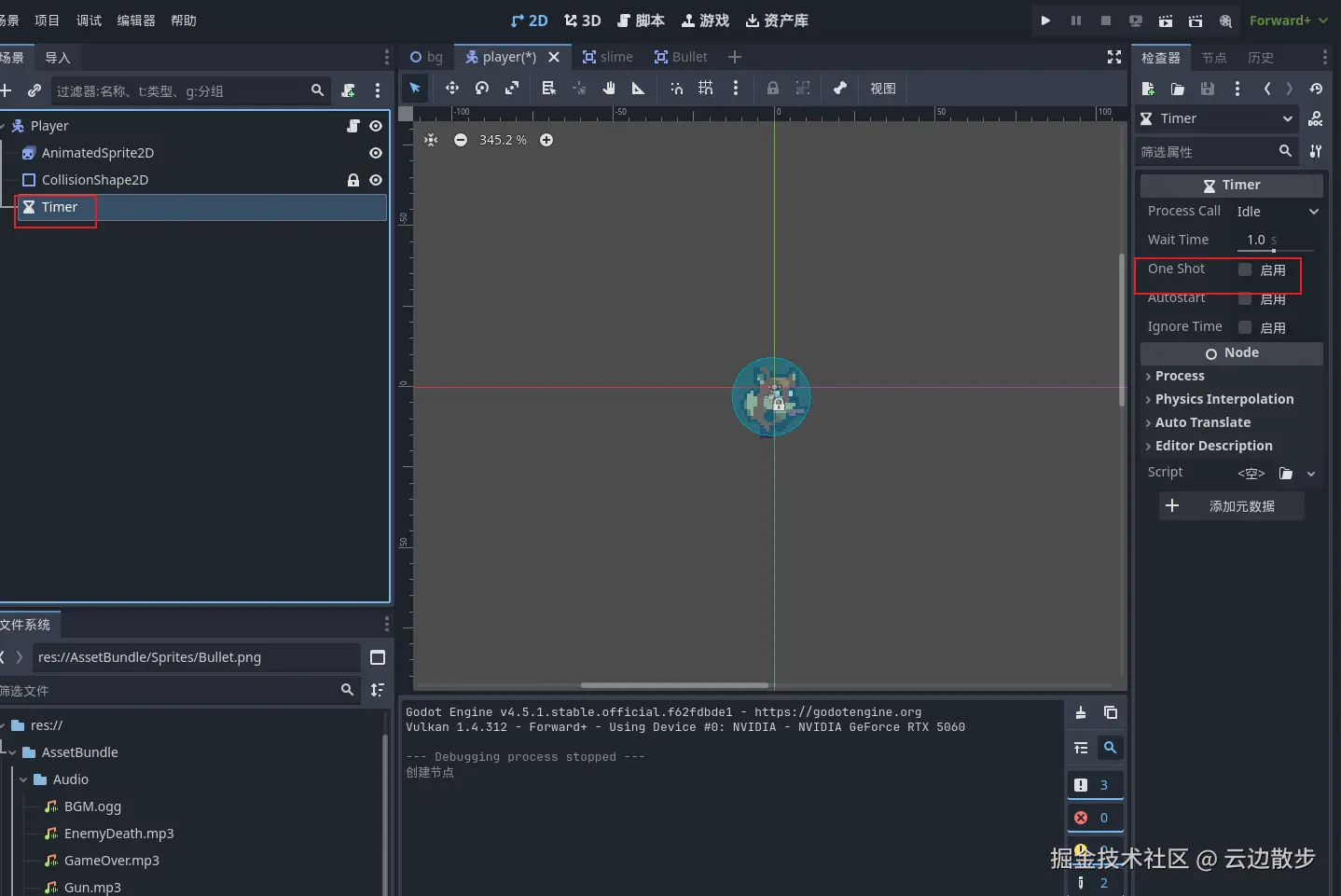 Timer节点,开启Autostart、关闭One Shot,通过timeout信号定时触发射击逻辑。在玩家脚本中预加载子弹场景,在计时结束时实例化子弹,将其生成位置设置为玩家(或枪口)附近,并加入当前场景作为子节点。为保证逻辑合理性,增加条件判断,仅在玩家站立且未死亡时才允许发射子弹。 - 最后对性能与逻辑进行优化:移除主场景中多余的子弹实例引用,统一由玩家动态生成;同时在子弹的