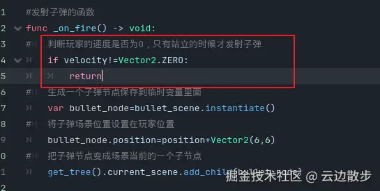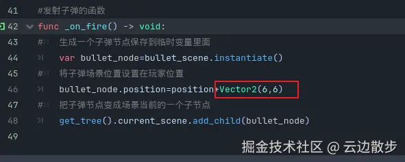 然后我们需要编写一下这个发射子弹的函数,先生成一个子弹节点保存到临时变量里面,然后将子弹场景位置设置在玩家位置,最后把子弹节点变成场景当前的一个子节点