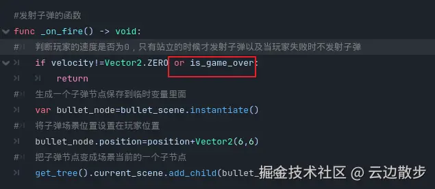 然后玩家死亡的时候就不能再发射子弹了,所以还有加一个判断玩家是否失败