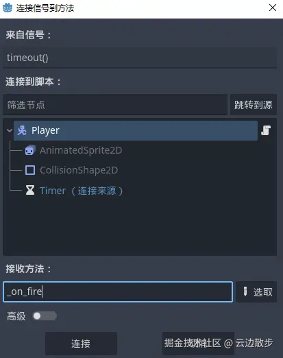 我们双击这个信号,将其链接到玩家场景的脚本代码上