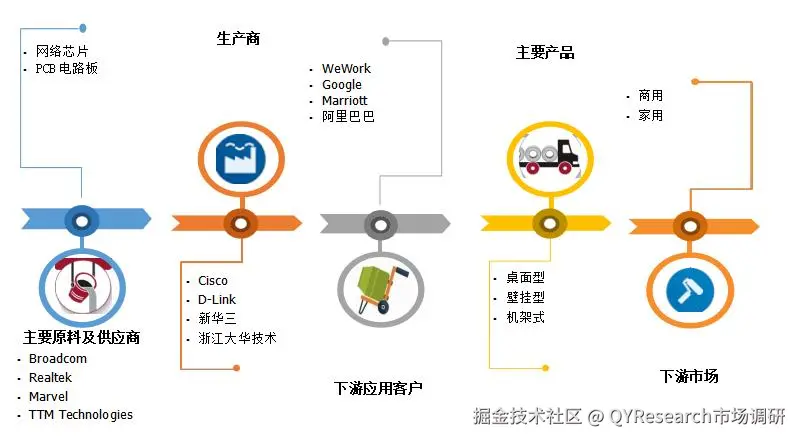 千兆无管理型交换机的上游主要包括网络芯片、PCB电路板、金属外壳、变压器、晶振、电容、电感和塑胶外壳等原材料供应商。主要芯片供应商包括 Broadcom、Realtek、Marvell、Intel、Qualcomm、MediaTek 等。下游应用领域广泛,涵盖家庭宽带路由、企业局域网、视频监控系统、智能楼宇、数据采集与控制系统 等。