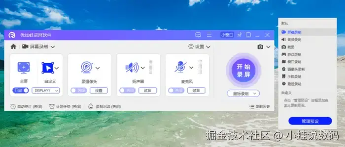 在屏幕录制软件领域,除了数据蛙,优加蛙录屏软件近年来也收获了大量年轻用户的认可。针对“录屏如何录入声音”这一核心需求,该软件配备了与数据蛙同等水平的详细调音面板,用户可通过精准调整参数,为后期音轨分离工作奠定良好基础。