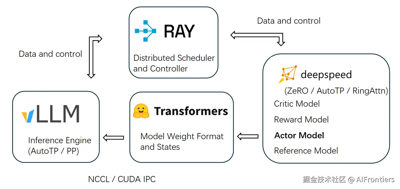 Ray 分布式 解耦 流派: 以OpenRLHF为代表,利用Ray框架将Actor、Critic等模型物理分离到不同的GPU组,并引入vLLM作为独立的推理引擎,大幅提升生成效率,适合大规模模型的生产级训练。