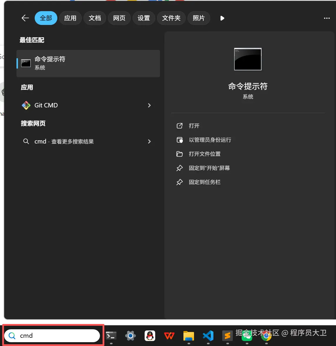 在开始菜单中搜索 cmd,然后点击打开。