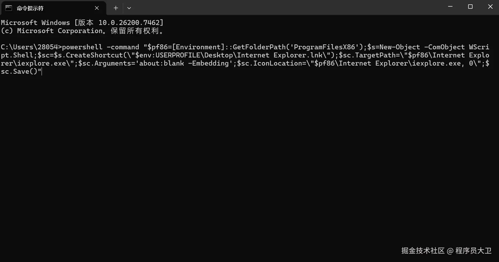 powershell -command "$pf86=[Environment]::GetFolderPath('ProgramFilesX86');$s=New-Object -ComObject WScript.Shell;$sc=$s.CreateShortcut(\"$env:USERPROFILE\Desktop\Internet Explorer.lnk\");$sc.TargetPath=\"$pf86\Internet Explorer\iexplore.exe\";$sc.Arguments='about:blank -Embedding';$sc.IconLocation=\"$pf86\Internet Explorer\iexplore.exe, 0\";$sc.Save()"