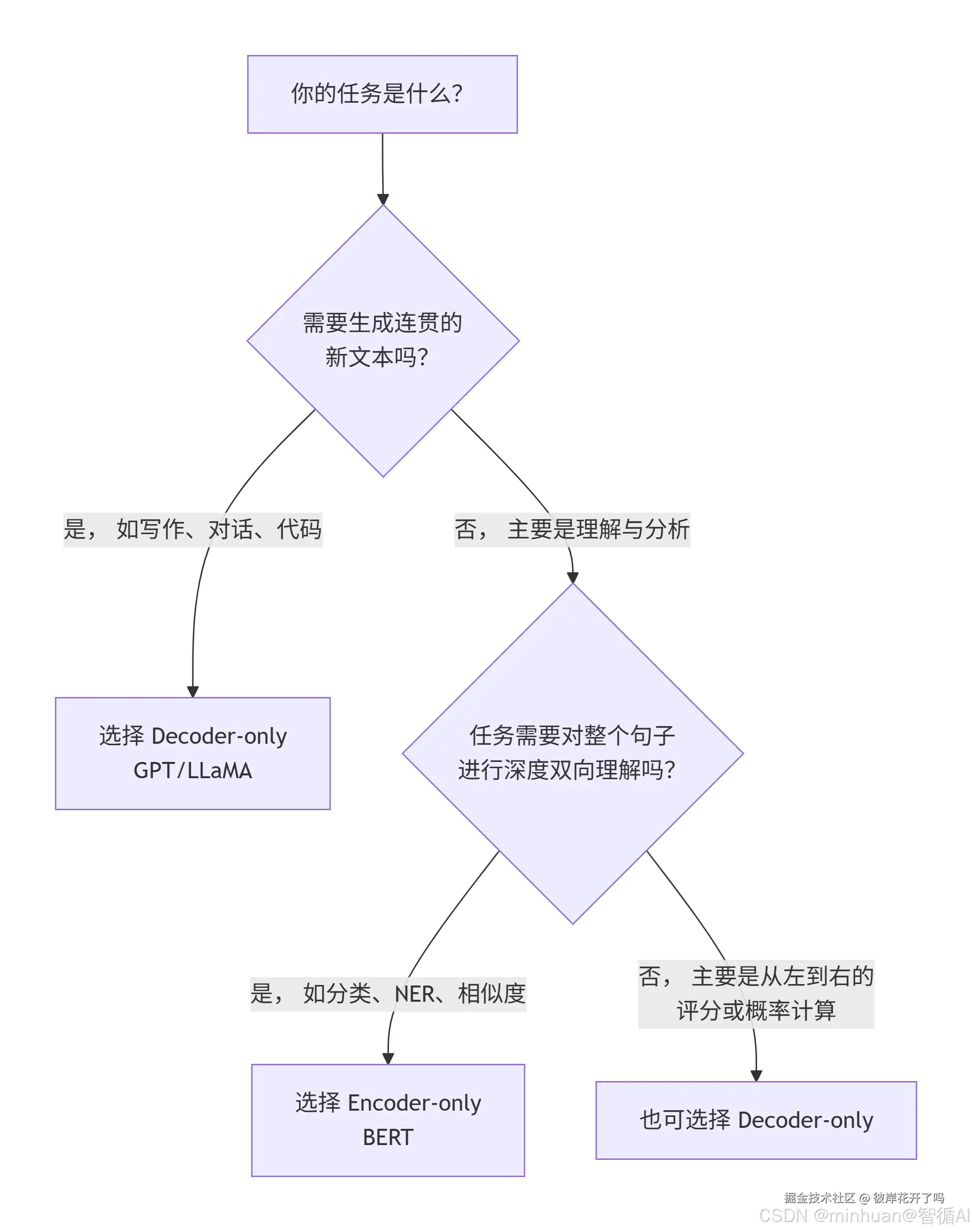 - 当我们需要对一段文本进行深度剖析、分类、提取信息或比较时,Encoder-only (BERT) 是更专业、更高效的工具。