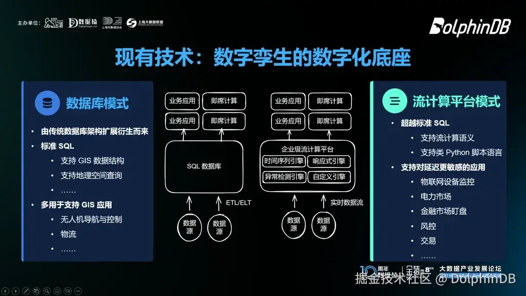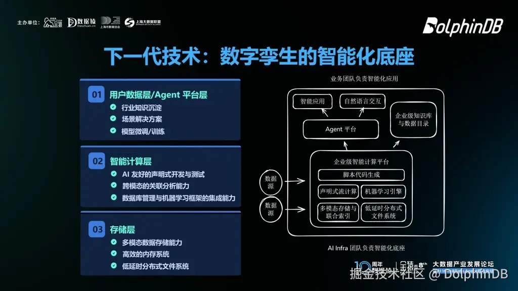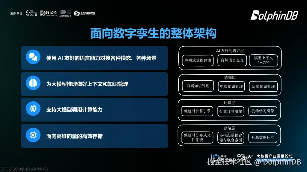 1月14日,在“第八届金猿大数据产业发展论坛——暨 AI Infra & Data Agent 趋势论坛”上,DolphinDB 首席架构师程训焘博士带来了主题为 《实时决策时代:AI 与低延时计算如何重塑数字孪生》 的分享。他的分享聚焦底层软件技术,深入探讨了 AI 与低延时计算如何推动数字孪生赋能实时决策。