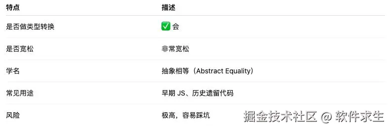 == 是抽象相等,会进行隐式类型转换后再比较,存在较多隐式规则和坑点;