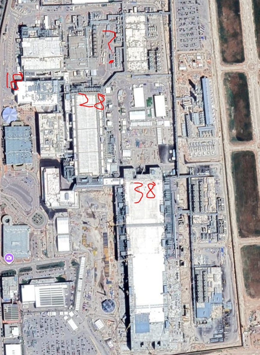 - Fab 38:正在建设中,预算超过250亿美元,洁净室面积与亚利桑那的Fab 52/62相当(68.5万平方英尺)。