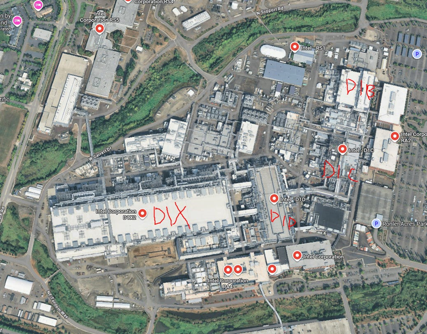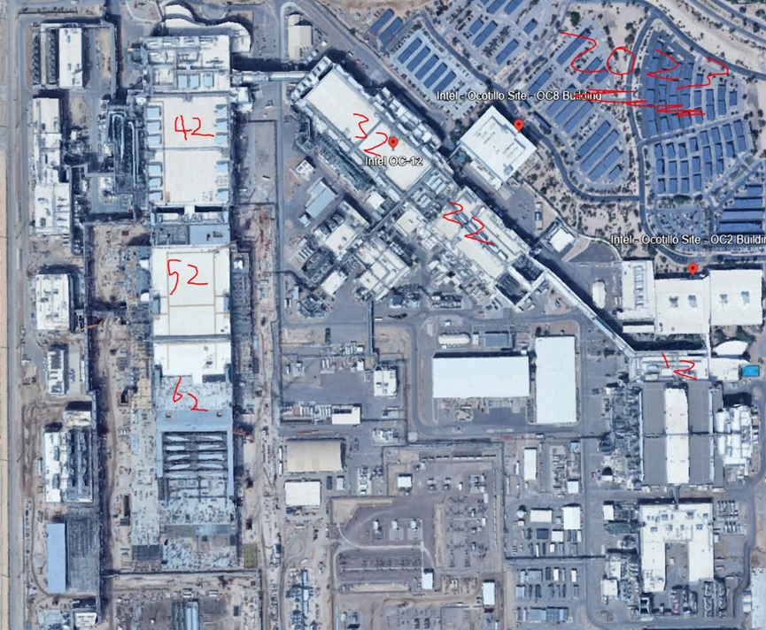 Fab 12 & 22:分别建于1994年和2000年。如果你想知道当年的美国基建速度有多快,Fab 22从动工到投产只用了18个月!这两座厂洁净室面积约为13-14万平方英尺,目前主要跑22nm、14nm和10nm (Intel 7)。
