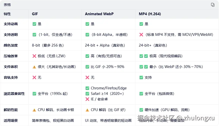 GIF、WebP(Animated)和 MP4 是三种常用于网页动效/短视频的格式,它们在压缩效率、功能支持、兼容性、性能等方面有显著差异。以下是详细对比: