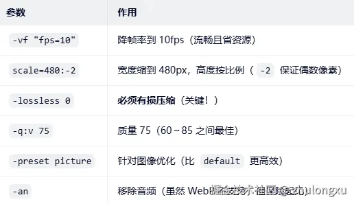 我的项目中,视频不需要音量,又要作为背景自动播放,webP就非常合适,而且ffmpeg可以直接把mp4转换为 webp。注意:转换过程中需要进行一些参数调整,避免webp体积过大导致卡顿(尤其是 大于10秒的视频)。