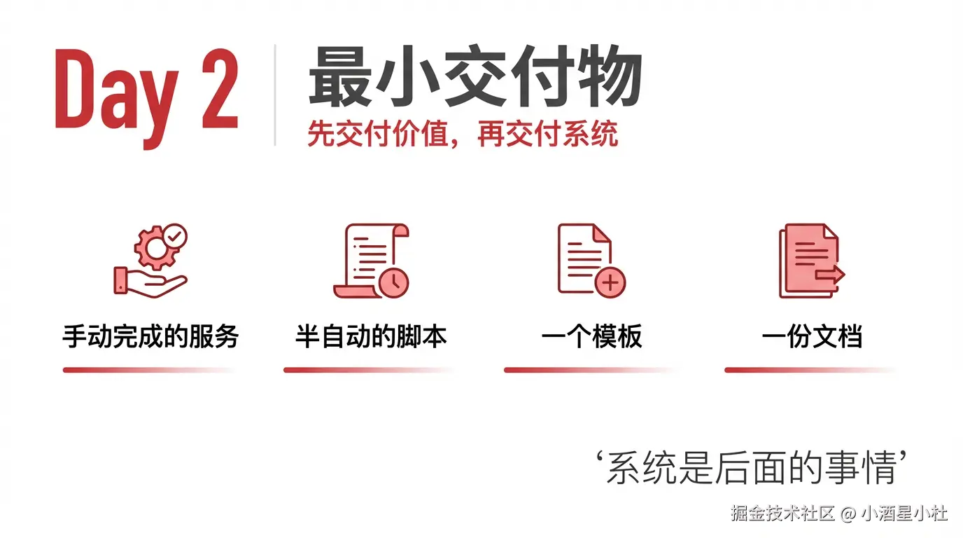 原则上只有一个: 先交付价值,再交付系统。 系统是后面的事情。