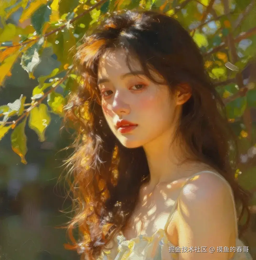 大师级作品,油画媒介,半身肖像,1个女孩,特写,斑驳的阳光,丁达尔效应(光柱),光斑落在皮肤上,温暖的金光,绚烂的色彩,丰富的笔触感,厚涂法,秋日氛围,柔焦,梦幻,极其细致的皮肤质感。