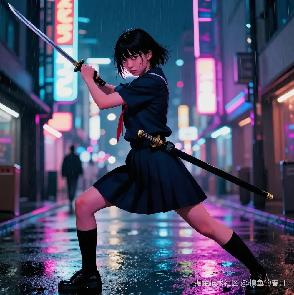 一张充满张力的漫画风格摄影作品。夜晚,霓虹灯闪烁的赛博朋克街道。一位身穿JK制服的少女,摆出专业的日本女武士拔刀起势姿态(居合道架势),身体重心下沉。她的左手紧握腰间的刀鞘,右手反手握住刀柄,准备拔刀。强烈的彩色霓虹光从她背后照射,勾勒出帅气的剪影轮廓光。她猛然回头看向身后,眼神警觉、锐利,又带有一丝被惊动的慌乱。雨夜湿漉漉的地面反射着光影,颗粒感,极具冲击力。