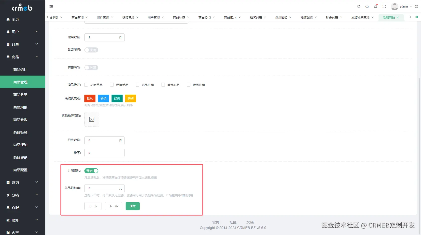 商家在添加/编辑商品时,在【营销设置】中开启商品的送礼功能。
