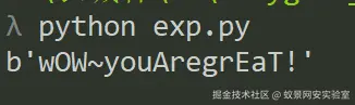 from Crypto.Cipher import AESkey = b"FanBglFanBglOoO!"ciphertext = bytes.fromhex("d458af702a680ae4d089ce32fc39945d")cipher = AES.new(key, AES.MODE_ECB)result = cipher.decrypt(ciphertext)print(result)