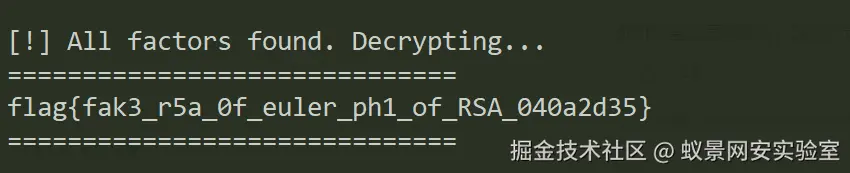 import mathfrom Crypto.Util.number import from tqdm import tqdm# --- 题目数据 ---n1 = 16141229822582999941795528434053604024130834376743380417543848154510567941426284503974843508505293632858944676904777719167211264225017879544879766461905421764911145115313698529148118556481569662427943129906246669392285465962009760415398277861235401144473728421924300182818519451863668543279964773812681294700932779276119980976088388578080667457572761731749115242478798767995746571783659904107470270861418250270529189065684265364754871076595202944616294213418165898411332609375456093386942710433731450591144173543437880652898520275020008888364820928962186107055633582315448537508963579549702813766809204496344017389879n = 484831124108275939341366810506193994531550055695853253298115538101629337644848848341479419438032232339003236906071864005366050185096955712484824249228197577223248353640366078747360090084446361275032026781246854700074896711976487694783856878403247312312487197243272330518861346981470353394149785086635163868023866817552387681890963052199983782800993485245670437818180617561464964987316161927118605512017355921555464359512280368738197370963036482455976503266489446554327046948670215814974461717020804892983665655107351050779151227099827044949961517305345415735355361979690945791766389892262659146088374064423340675969505766640604405056526597458482705651442368165084488267428304515239897907407899916127394598273176618290300112450670040922567688605072749116061905175316975711341960774150260004939250949738836358264952590189482518415728072191137713935386026127881564386427069721229262845412925923228235712893710368875996153516581760868562584742909664286792076869106489090142359608727406720798822550560161176676501888507397207863998129261472631954482761264406483807145805232317147769145985955267206369675711834485845321043623959730914679051434102698588945009836642922614296598336035078421463808774940679339890140690147375340294139027290793c = 657984921229942454933933403447729006306657607710326864301226455143743298424203173231485254106370042482797921667656700155904329772383820736458855765136793243316671212869426397954684784861721375098512569633961083815312918123032774700110069081262242921985864796328969423527821139281310369981972743866271594590344539579191695406770264993187783060116166611986577690957583312376226071223036478908520539670631359415937784254986105845218988574365136837803183282535335170744088822352494742132919629693849729766426397683869482842748401000853783134170305075124230522253670782186531697976487673160305610021244587265868919495629e = 65537# 你之前找到的那个因子,我们可以直接用,减少工作量known_factor = 12094541303222723616975666632268830751848445571951987169074250626437877110205699058506111384472586354084793914769711672322551034923778729430162356351731919def get_primes(limit): ps = [] is_p = [True] * (limit + 1) for p in range(2, limit + 1): if is_p[p]: ps.append(p) for i in range(p * p, limit + 1, p): is_p[i] = False return psprint("[] Generating primes...")primes = get_primes(220 + 2000)n1_factors = {known_factor}curr_n = n# 初始化 A。注意:要在当前的 curr_n 下运算A = pow(3, n1, curr_n)print("[*] Starting robust factorization...")for p in tqdm(primes): # 计算 p 的最高幂次 p_pow = p while p_pow * p <= 220: p_pow *= p A = pow(A, p_pow, curr_n) # 检查当前因子 g = math.gcd(A - 1, curr_n) # 如果找到了因子(哪怕是多个因子的乘积),我们都要处理 if 1 < g < curr_n: # 这里可能 g 包含了 p, q 等。为了提取 n1 的因子, # 我们需要尝试把 g 里的每一个素因子抠出来。 # 简单的方法:直接用 g 去试探 n1 f = math.gcd(g - 1, n1) if f > 1: # 彻底分解 f temp_f = f for k in list(n1_factors): while temp_f % k == 0: temp_f //= k if temp_f > 1 and isPrime(temp_f): n1_factors.add(temp_f) print(f"\n[+] Found n1 factor: {temp_f}") # 核心改进:从当前模数中剔除已发现的因子,防止 GCD 变成 n curr_n //= g A %= curr_n elif g == curr_n: # 这种情况通常由于 base 的选择导致,但在本逻辑中通过 A %= curr_n 极难发生 # 如果发生了,说明当前的 A 已经在所有因子上都等于 1 了 break if len(n1_factors) >= 4: break# 补全逻辑if len(n1_factors) == 3: p = 1 for x in n1_factors: p *= x n1_factors.add(n1 // p)if len(n1_factors) >= 4: factors = list(n1_factors) print("\n[!] All factors found. Decrypting...") phi = 1 for f in factors: phi *= (f - 1) d = inverse(e, phi) m = pow(c, d, n1) flag = long_to_bytes(m) print("="*30) # 查找 flag 字符串 if b'flag' in flag: print(flag[flag.find(b'flag'):].split(b'}')[0].decode() + '}') else: print(f"Decrypted (hex): {flag.hex()}") print("="*30)else: print(f"\n[-] Still missing factors. Found: {len(n1_factors)}")