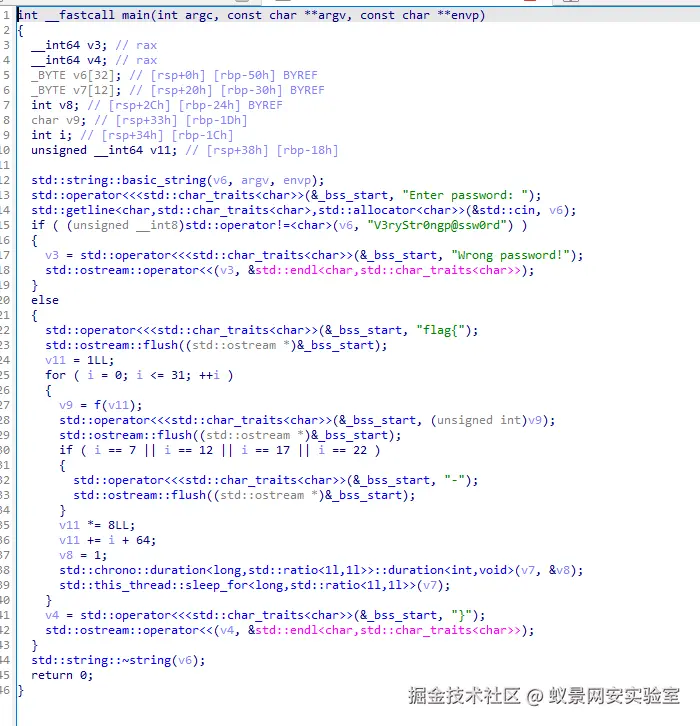 for ( i = 0; i <= 31; ++i ) { v9 = f(v11); // 调用关键函数 f,基于当前状态 v11 计算出一个字符 std::operator<<<...>((unsigned int)v9); // 打印该字符 // 格式化控制:插入连字符 if ( i == 7 || i == 12 || i == 17 || i == 22 ) { std::operator<<<...("-"); } // 状态更新公式 (核心数学逻辑) v11 *= 8LL; v11 += i + 64; // 延时处理 v8 = 1; std::this_thread::sleep_for(...); // 每秒打印一个字符,增加仪式感}