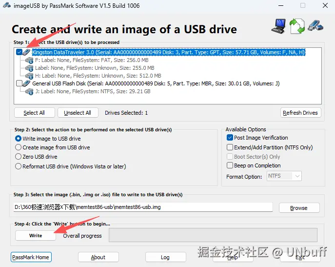 工具自动识别MemTest86镜像(memtest86-usb.img),确认无误;