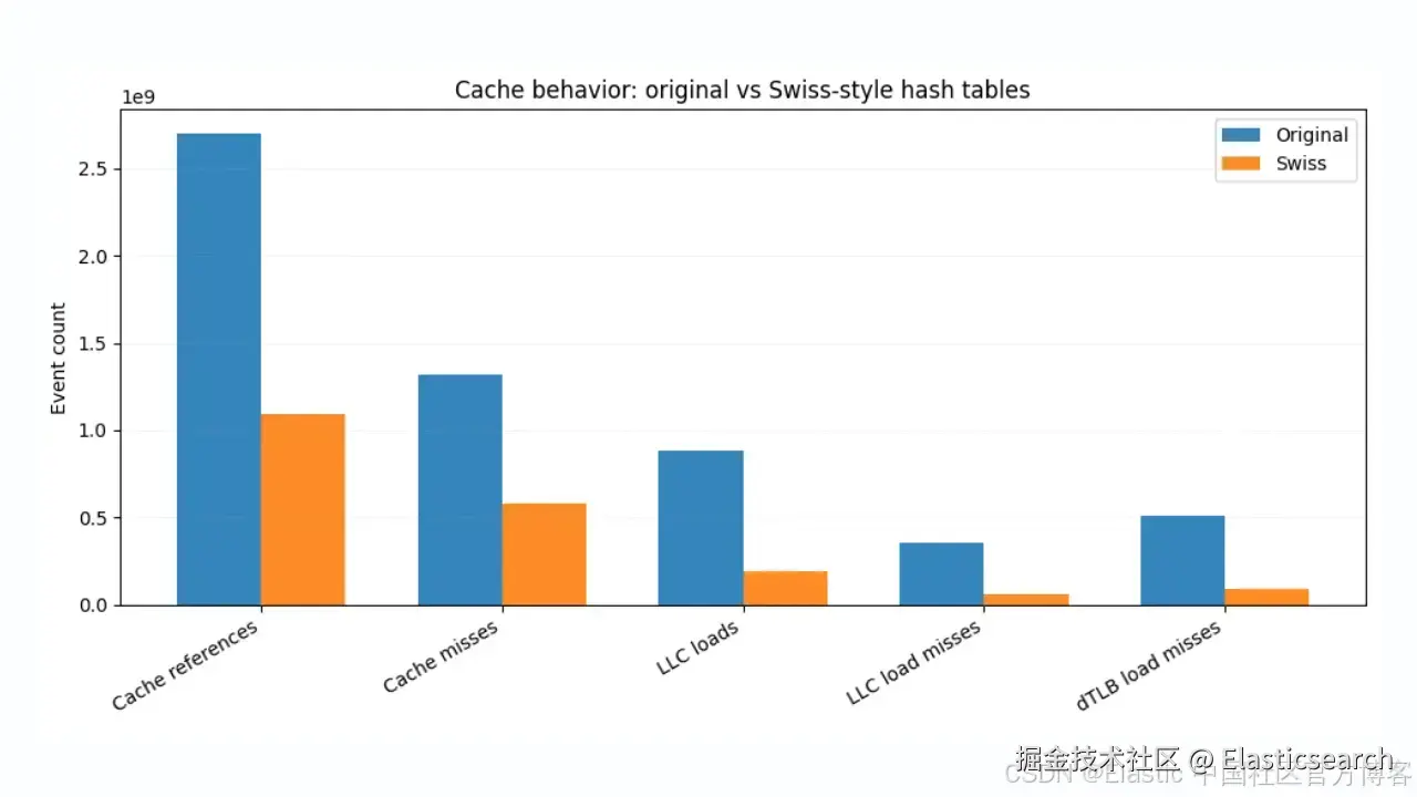 我们最近将 Elasticsearch 的哈希表实现的关键部分替换为瑞士风格设计,并在均匀、高基数的工作负载上观察到构建和迭代时间提高了 2–3 倍。结果是更低的延迟、更高的吞吐量,以及 Elasticsearch Query Language ( ES|QL ) 统计和分析操作更可预测的性能。