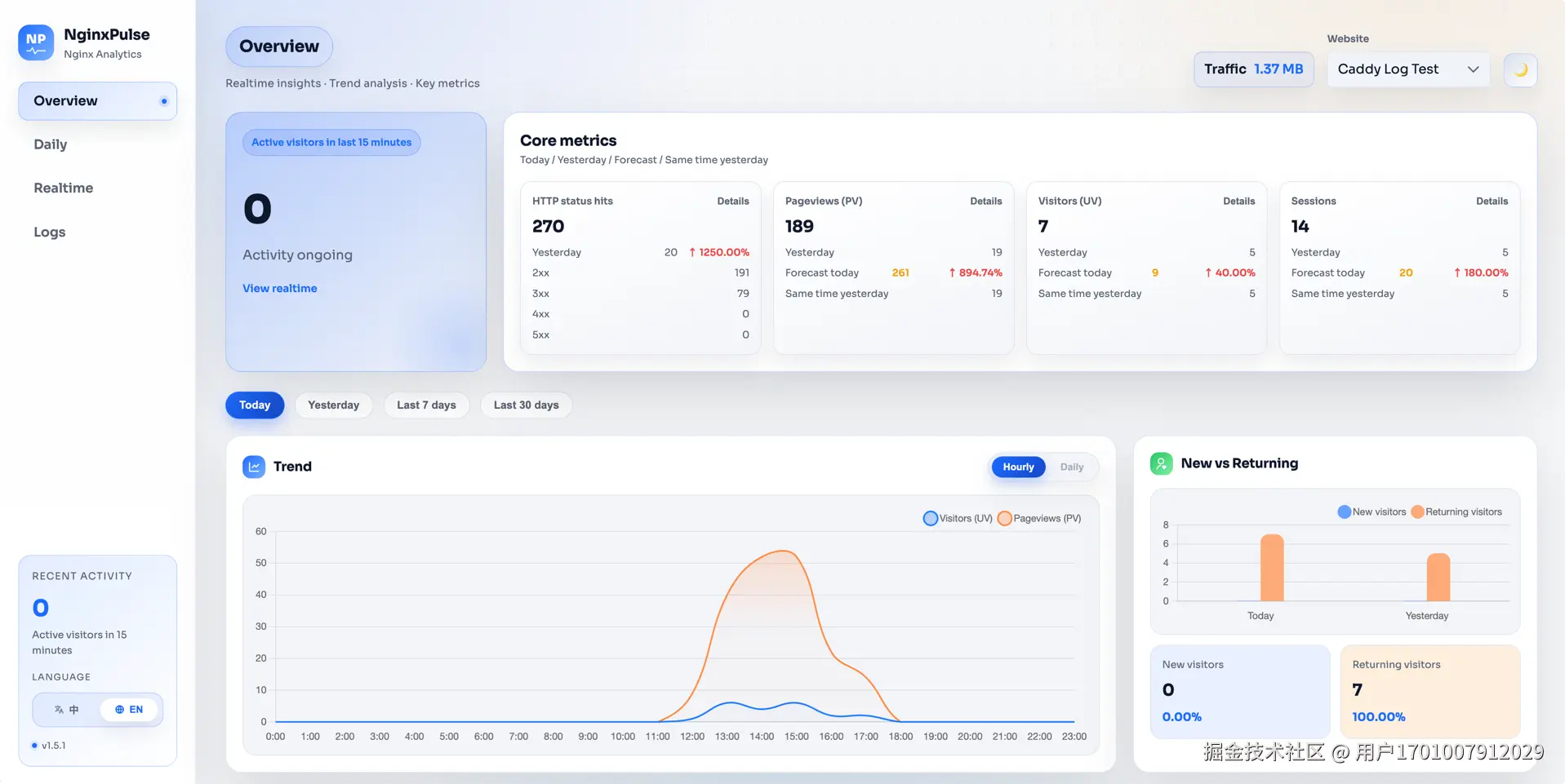 之前试过 GoAccess、ELK 那一套,要么配置麻烦,要么太重量级。最近发现了一个叫 NginxPulse 的项目,用下来感觉还不错,分享给大家。