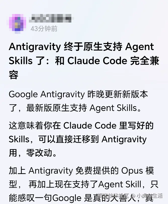 前几天,Google Antigravity 更新了原生支持 Agent Skills 的消息刷爆了朋友圈。